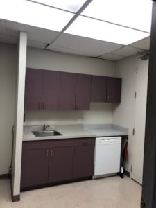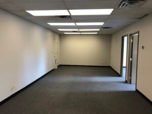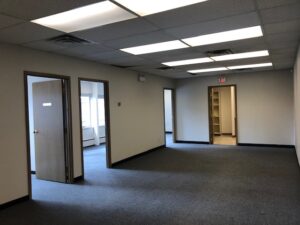 Quiet office space featuring 2 private offices (easy conversion to 3), kitchenette and an open reception/work area for a total of 1,181 square feet.