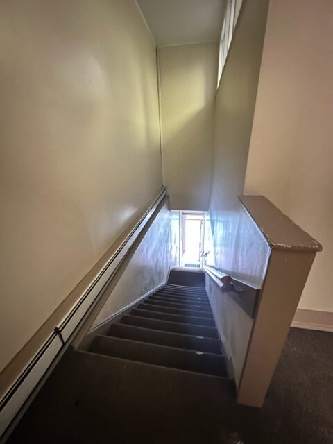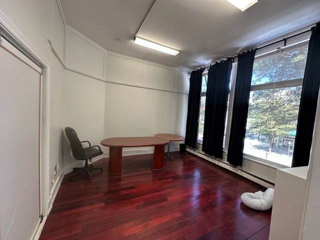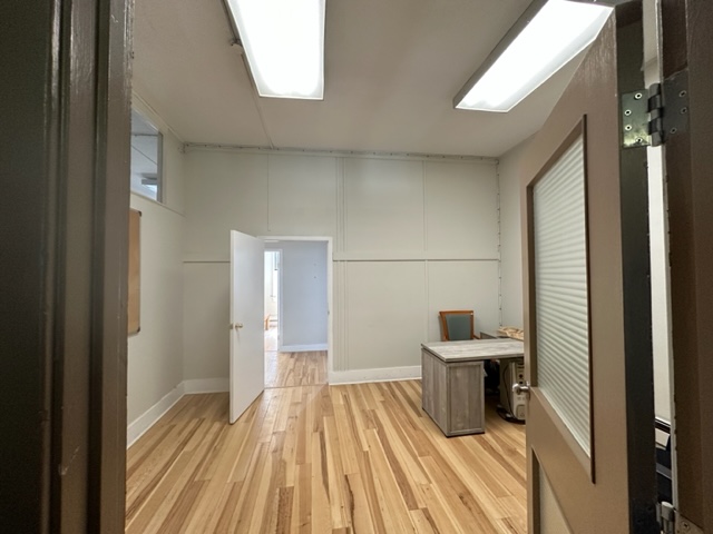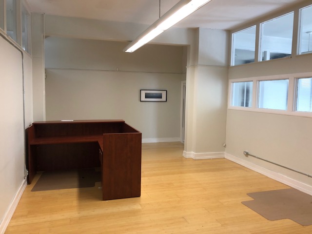 Second floor offices with 11 ft ceilings and large exterior windows front and